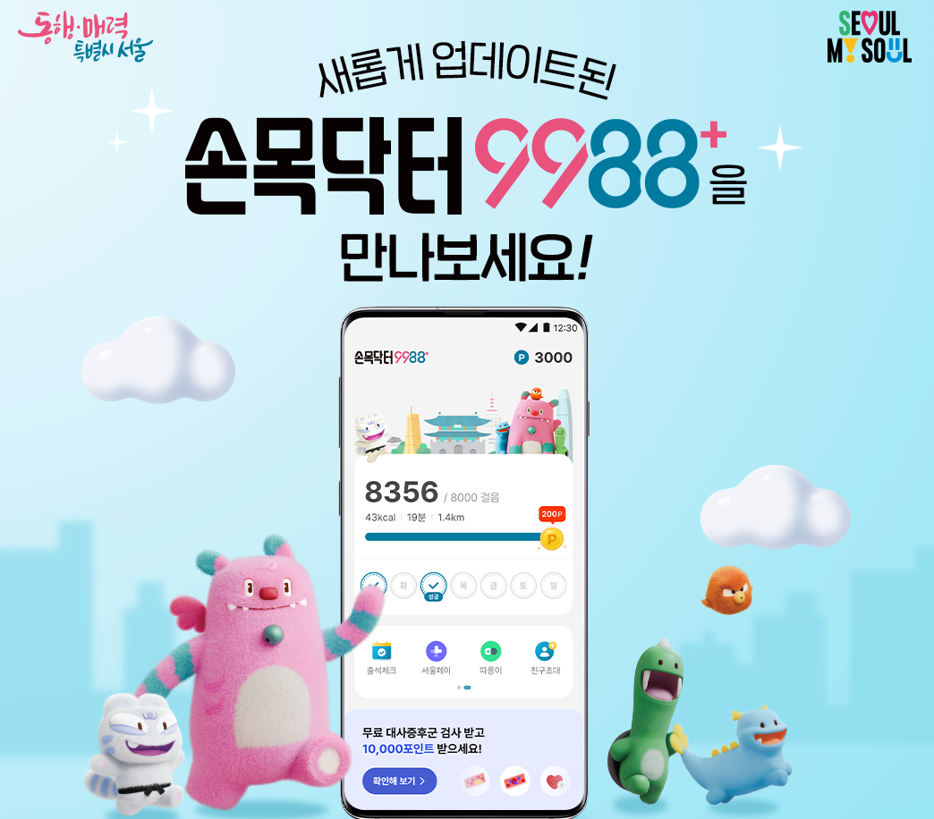 ‘손목닥터9988+’는 서울시민이 건강을 쉽게 관리할 수 있도록 돕는 혁신적인 헬스케어 앱이다. 걸음 수 측정, 건강 챌린지, 대사증후군 관리 등 다양한 기능을 통해 사용자의 건강 증진을 목표로 하며, 포인트 적립 시스템을 통해 재미와 실질적인 혜택도 제공한다.