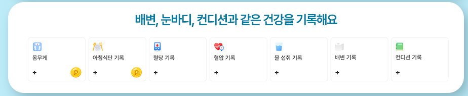 건강 기록 기능 강화: 배변, 눈바디(신체 변화 기록), 컨디션 등 다양한 건강 관련 기록을 추가할 수 있음