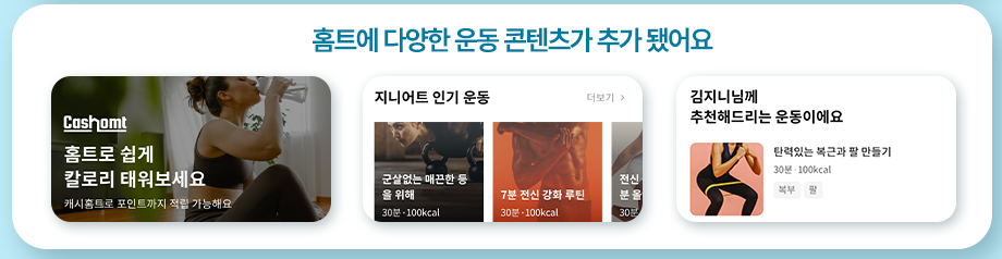 홈트 콘텐츠 추가: 집에서 쉽게 따라 할 수 있는 다양한 운동 콘텐츠가 추가되어 사용자 맞춤형 홈트레이닝 가능